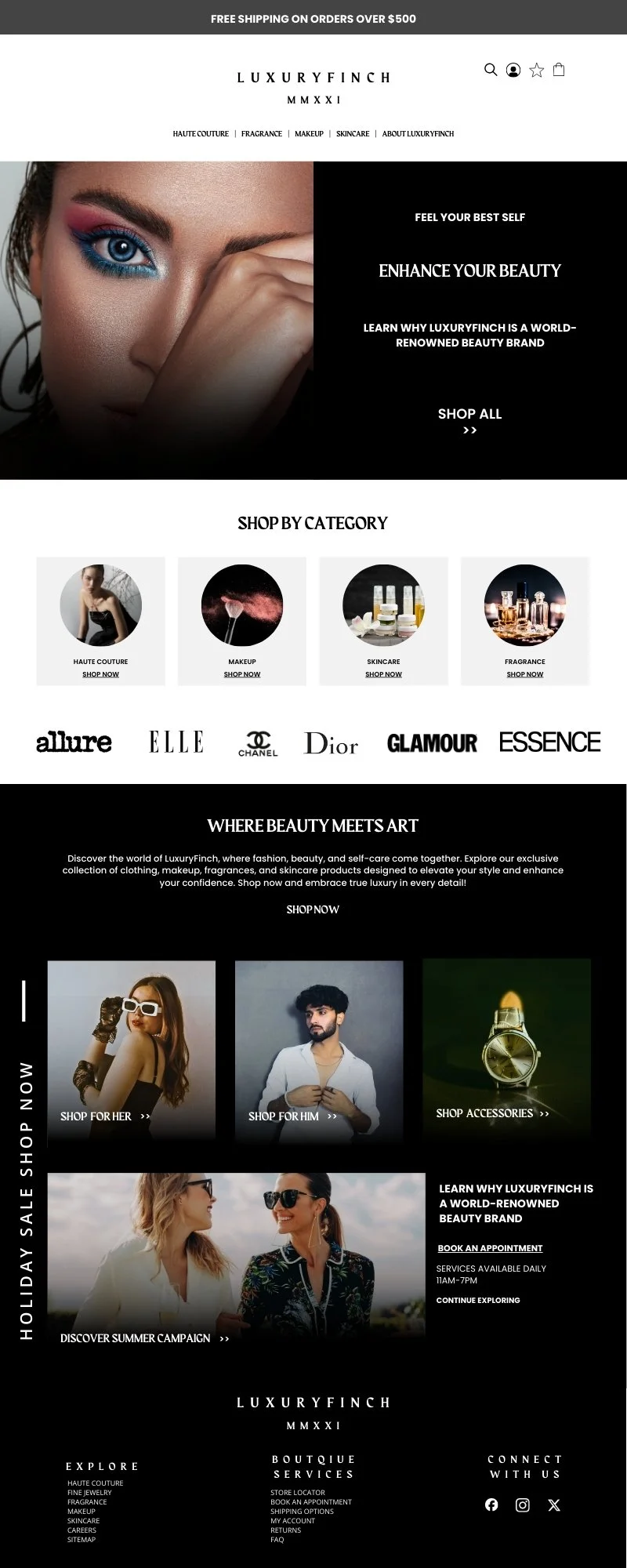 As a recognized player in the luxury market, LuxuryFinch needed to elevate its digital presence and branding to match its exceptional products. The brand required a refreshed logo, high-end business cards, and an eCommerce website capable of providing a seamless shopping experience. Additionally, LuxuryFinch wanted to captivate its audience through striking social media posts and ads, creating a stronger connection with its affluent clientele and reaching new customers globally.